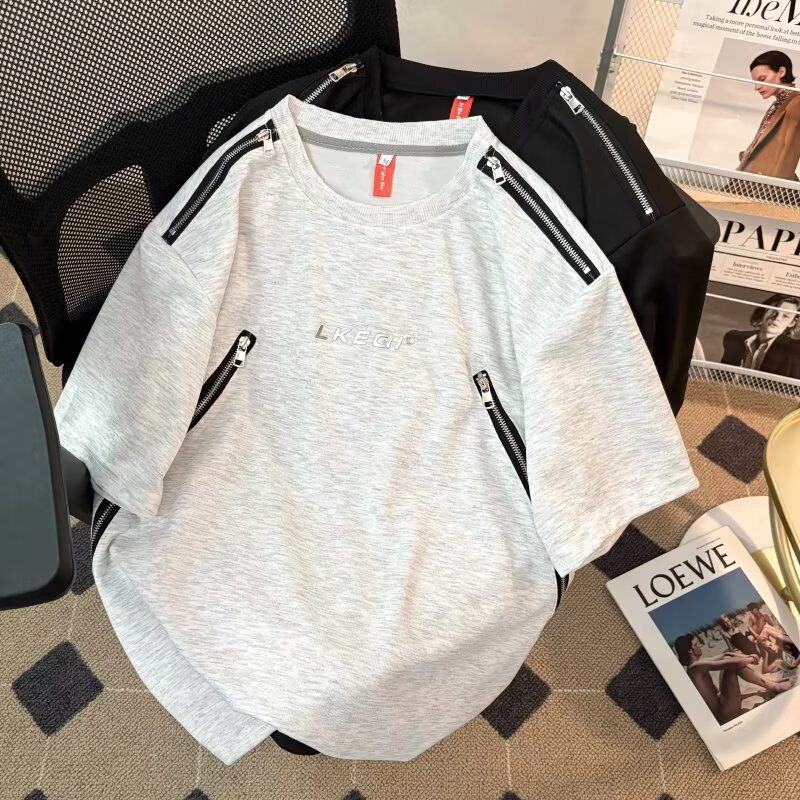 オリジナルメタルショルダーパッド半袖アメリカンハイストリートジッパーTシャツ男女兼用ラウンドネックヘビーデザイン右肩五分袖