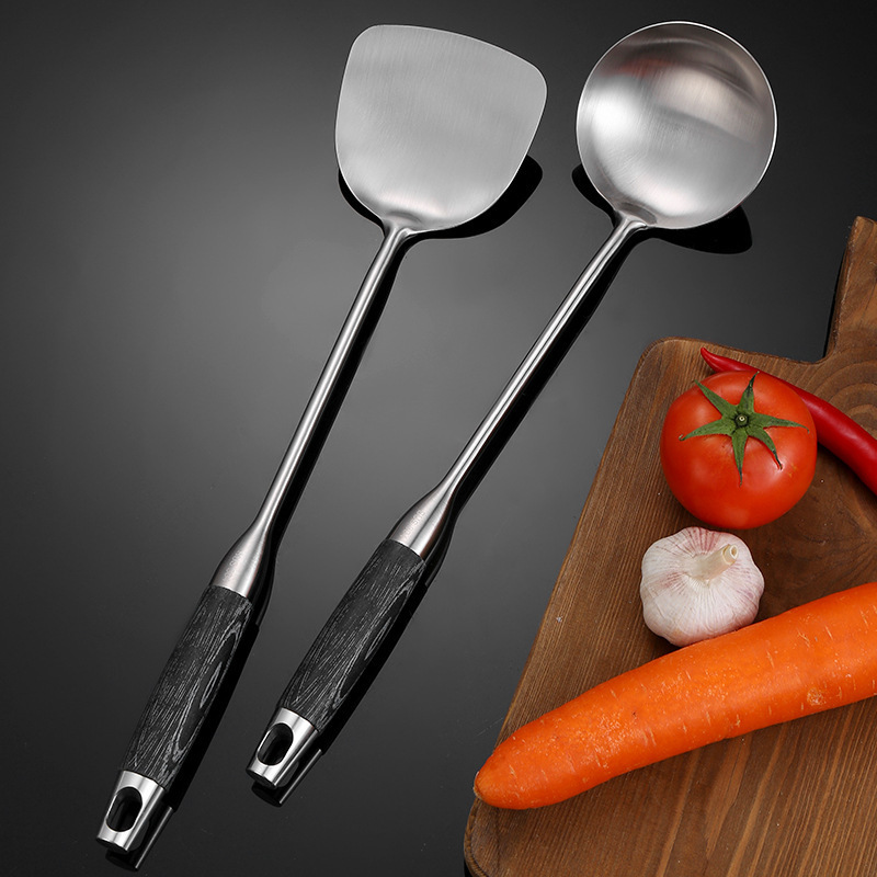 201 ステンレス鋼のフライパンスプーン、フライパンスパチュラ、ザル、クッキングスプーン、木製ハンドル、家庭用長柄スープスプーン、サービングスプーン、ポットスプーン