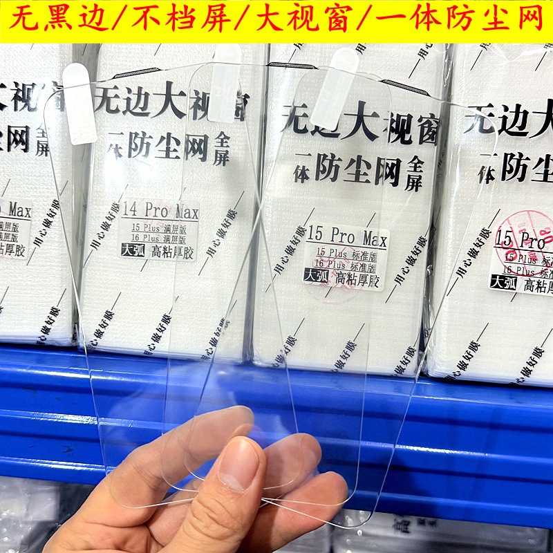 黒縁のない全画面膜はアップル16携帯電話強化膜iPhone15大窓に防塵ネット保護膜がついている