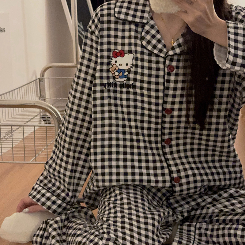 日系ins春秋パジャマ女性純綿ガーゼ赤ちゃん綿長袖黒格子ホームウェア2点セット女性