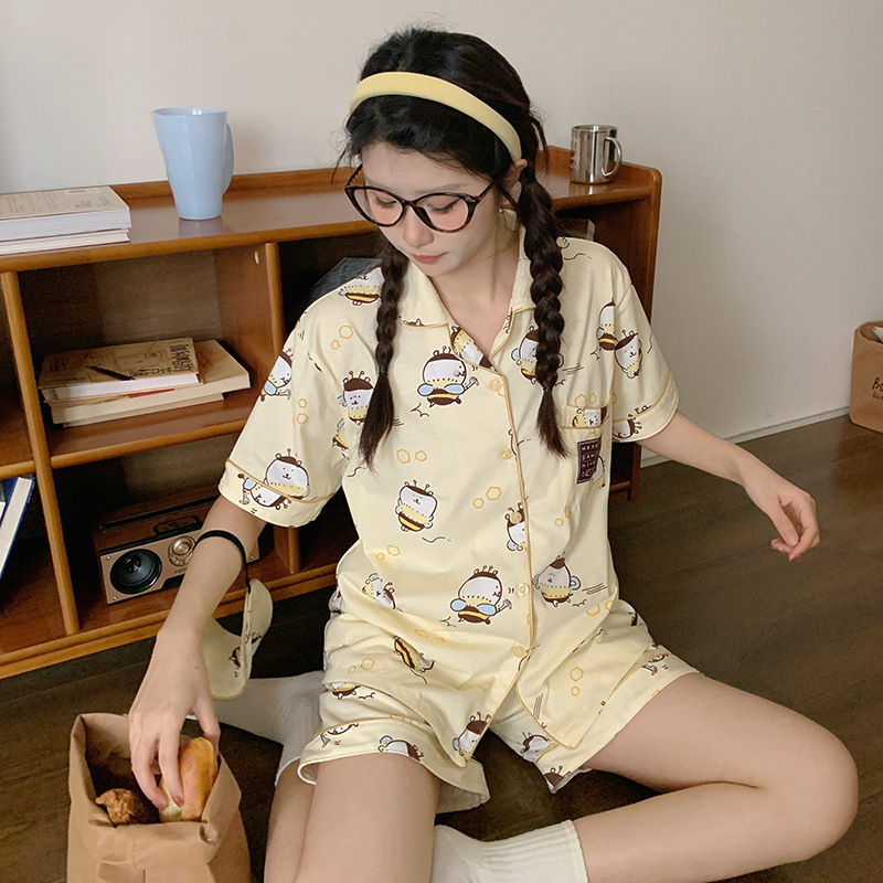 韓国insパジャマ女性夏新作純綿半袖アニメ少女学生ホームウェア2点セット外着可