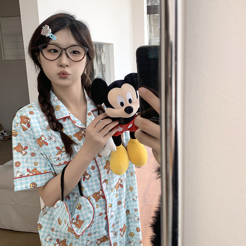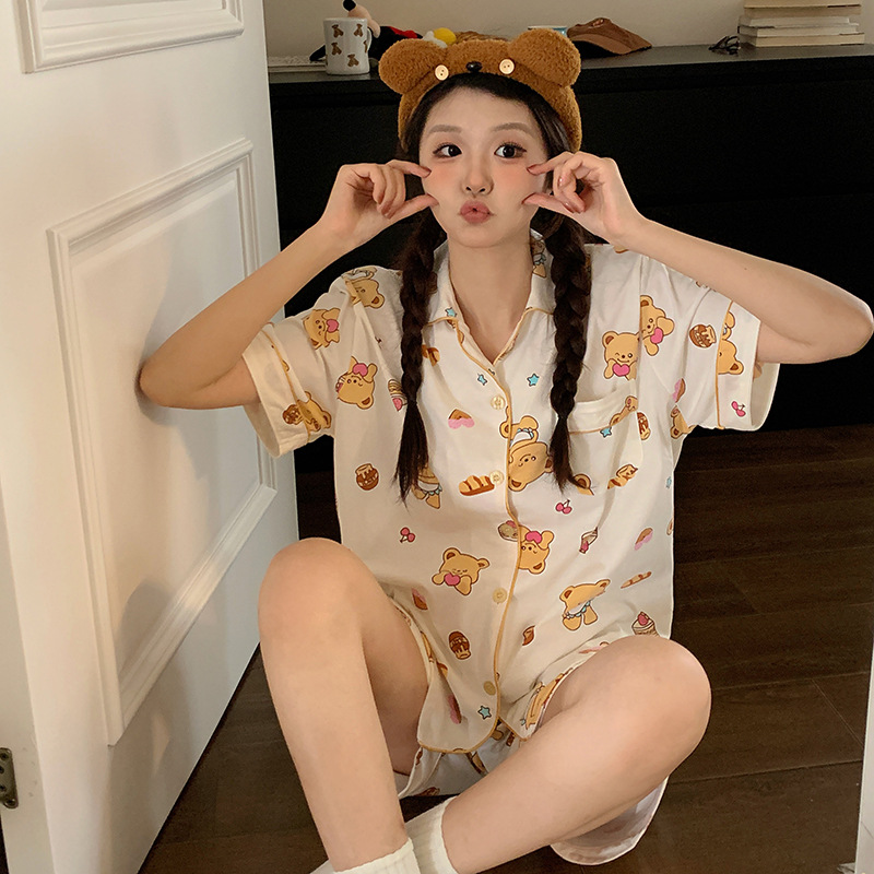 日本のかわいい自嘲熊パジャマ女性夏の新型純綿半袖半ズボンアニメ家庭服セットは外着ができます。