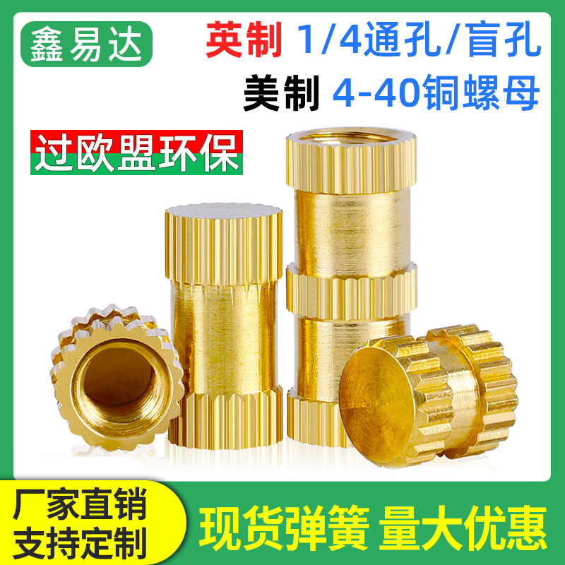 イギリスのホットメルト銅ナット1/4-20歯美製4-40穴を通してブラインド穴を埋めて射出成形します。