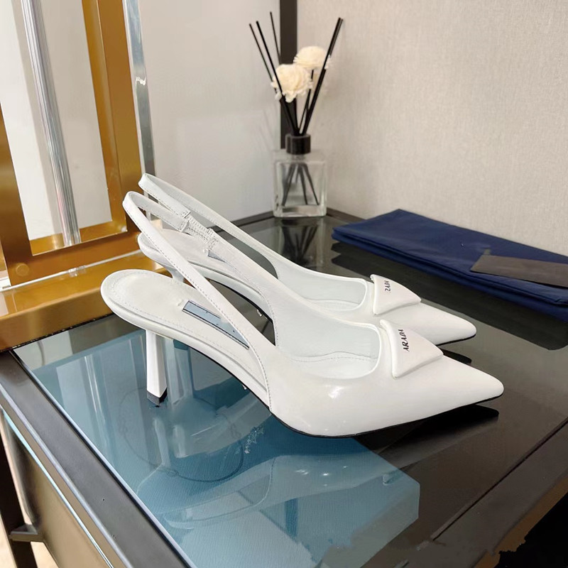 P家三角ロゴハイヒール2024ポインテッドトゥ7.5cm細ヒールサンダル欧米風フレンチキャットヒールポインテッドトゥ細見え