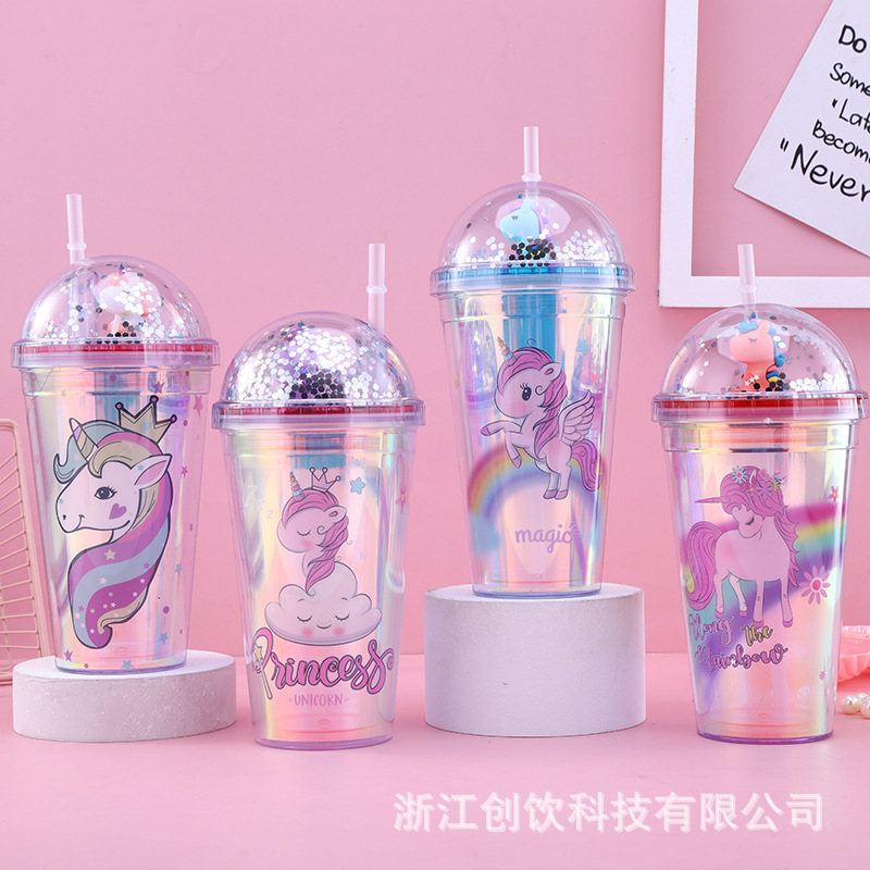 カラフルな漫画ユニコーン二重ストローカップかわいい女の子の夏の必須アイテムは彼女の親友を送ることができる