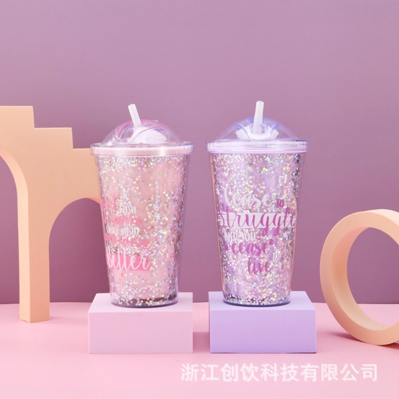 韓国版創意高颜値ネット赤星空閃粉プラスチックカップ落書き星二重ストローカップ