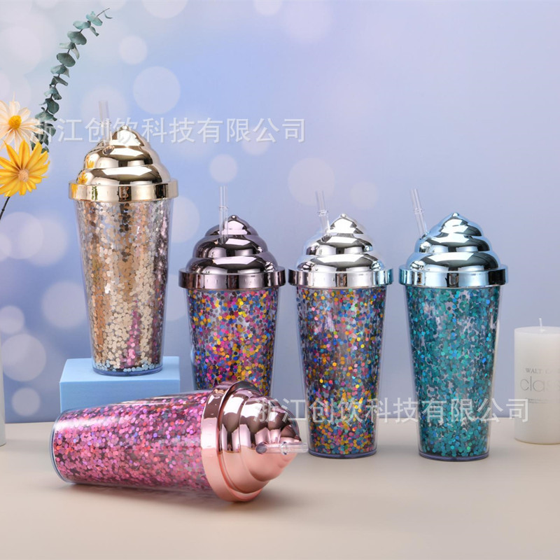 メーカー現物アイスクリーム二重プラスチックストローカップ夏大容量アニメ氷カップメッキ蓋付きカップ