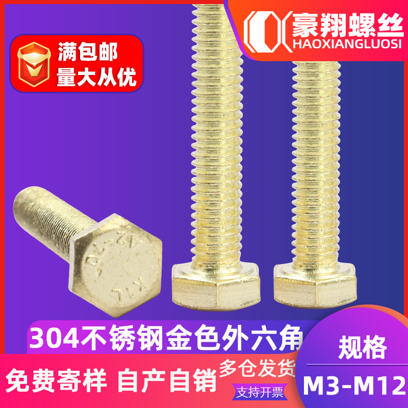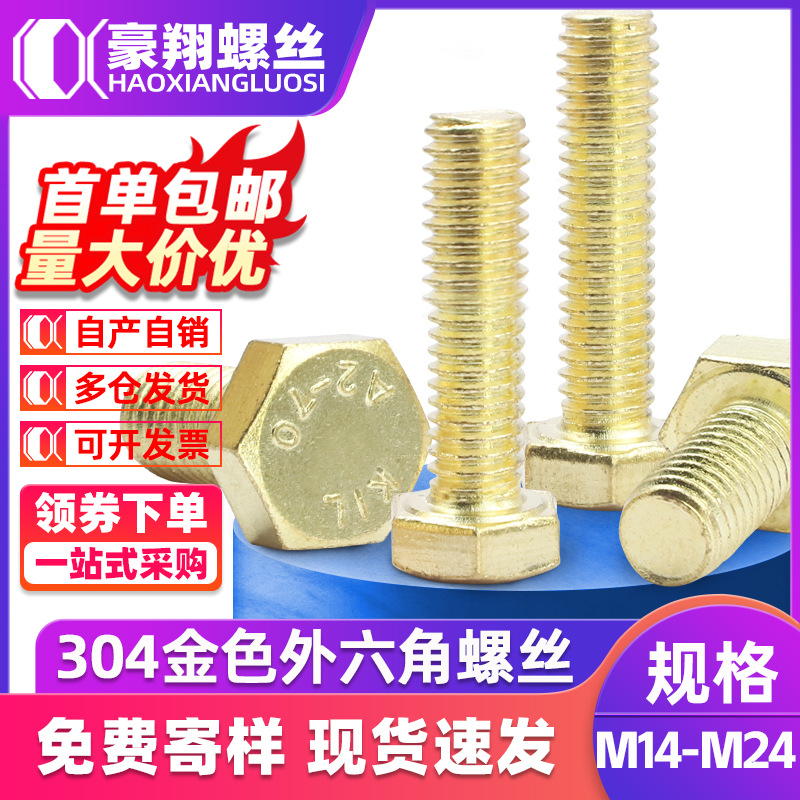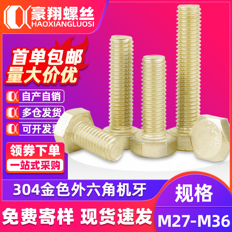 304ステンレスメッキ金色外六角ねじメーカー卸売り全歯六角頭ボルトm27m30m33m36