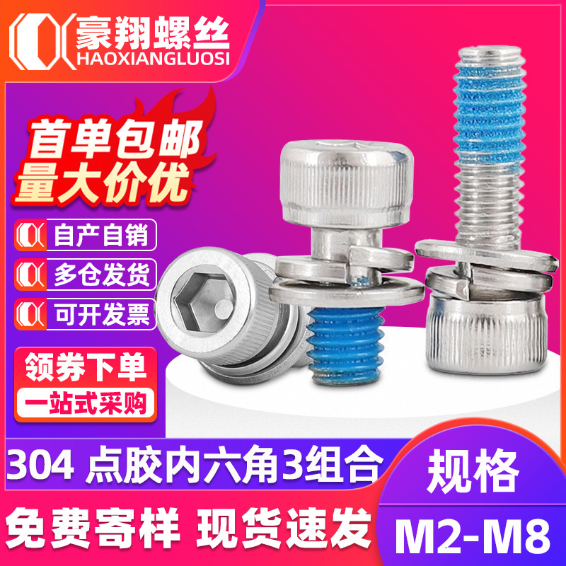 304 ステンレス鋼カップヘッド六角穴付き三連接着剤散布ネジ、青色接着剤円筒ボルト M2M3M4M5M6M8