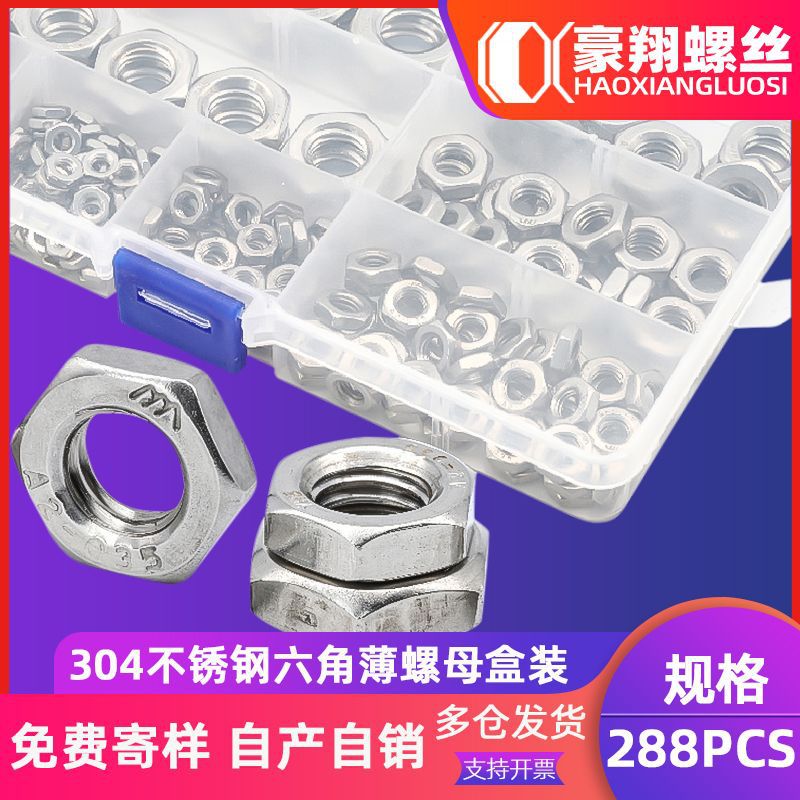288pcs薄いナットボックスフラットナット六角薄いナットセットナット304ステンレス鋼din934