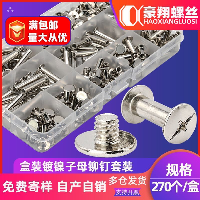 メーカー卸売り270pcs/ニッケルメッキ子母リベットセット帳簿釘突合せ対ロックねじ子母釘ケース