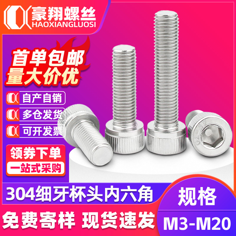 304不锈钢细牙内六角螺丝幼牙螺钉杯头螺栓圆柱头螺丝M3/M4/M5/M6