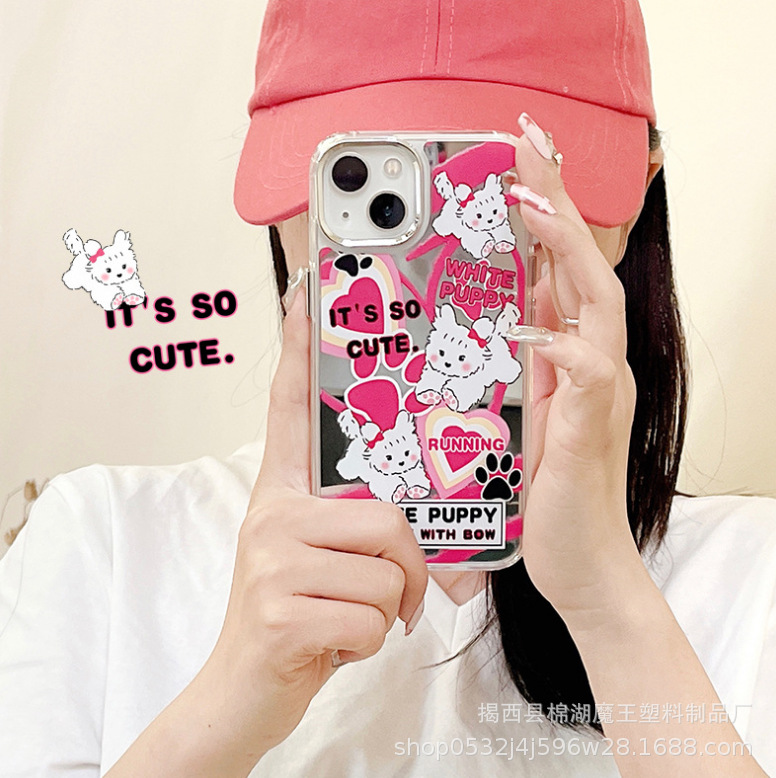 白い子犬iphone15は三合一鏡面14proメッキ保護カバー13/12携帯ケース11を適用している