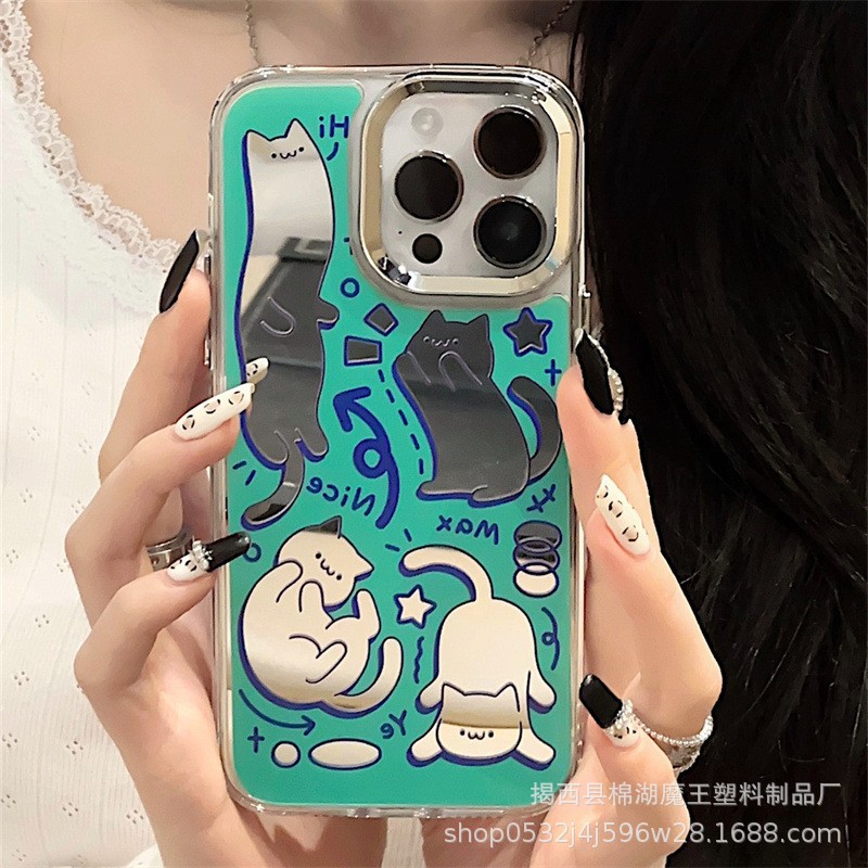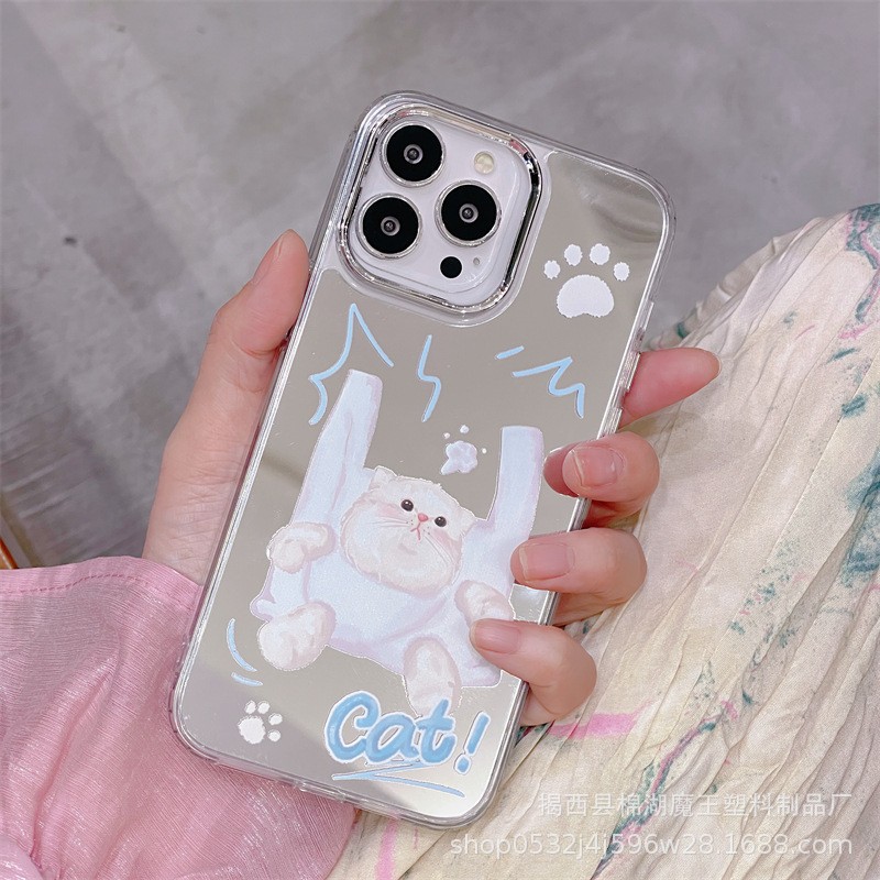 ビニール袋猫適用アップル15plus携帯ケースiphone14鏡面13promax三合一保護カバー