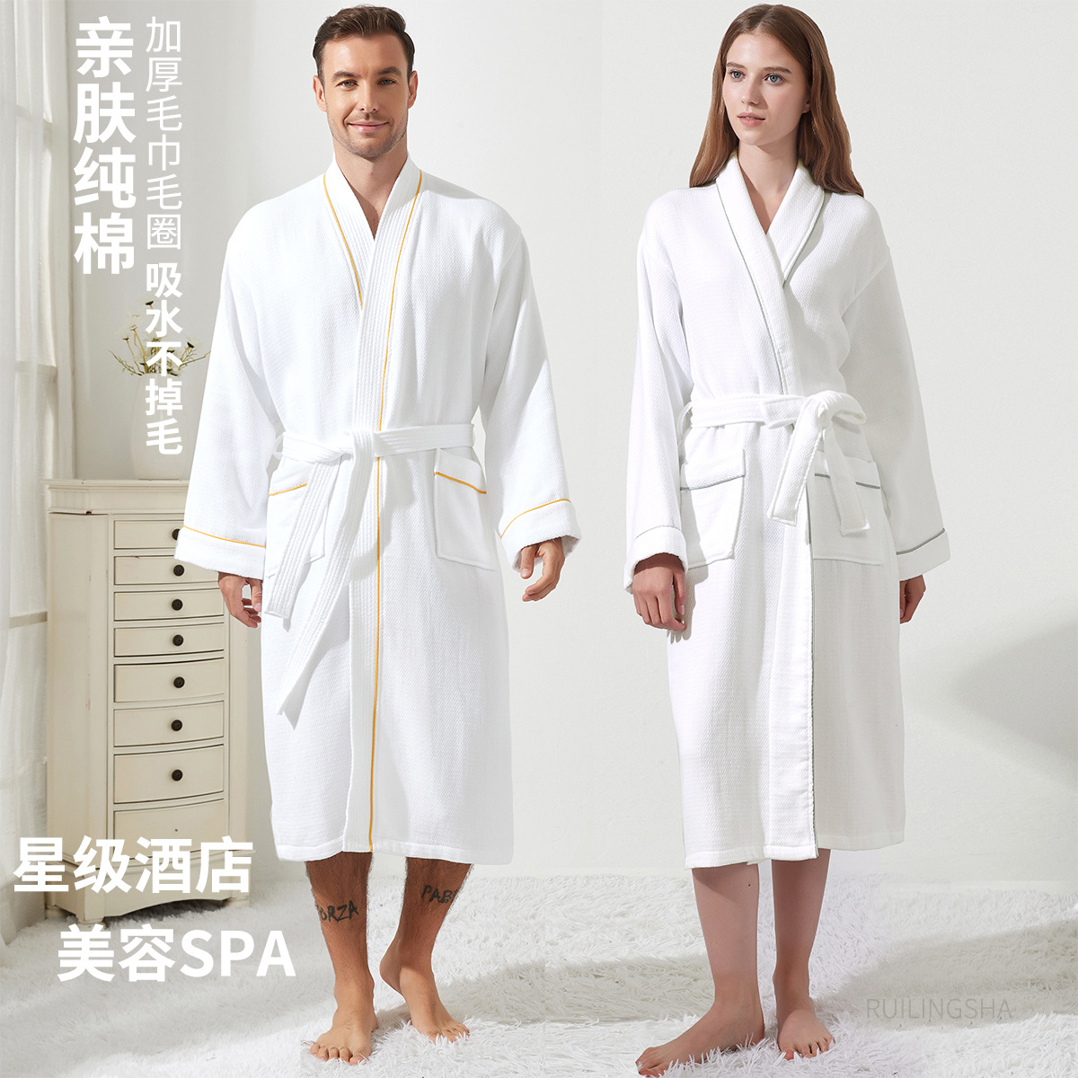 カップル用厚手の純綿タオルバスローブ、ロングスタイル、男女兼用、オールシーズン対応、テリー素材、吸水性、速乾性、カップル用ナイトガウン