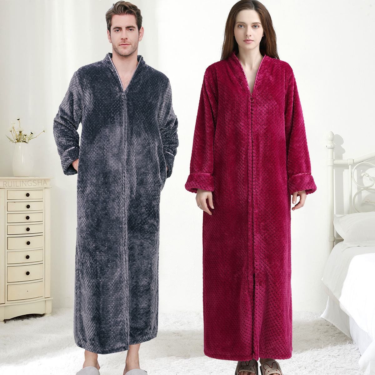 カップル秋冬用ジッパー付き厚手保温大きいサイズフランネルナイトガウン女性用ロング丈カップル用コーラルベルベットナイトガウン男性用バスローブ