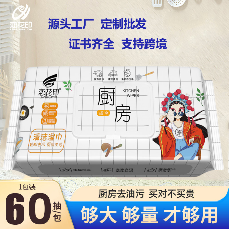 キッチン用ウェットティッシュ 強力油汚れ落とし 60枚入り 大容量 厚手キッチンペーパー 家庭用レンジフード油汚れ落としウェットティッシュ