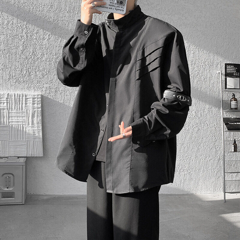 2025- 高街風小衆シワデザイン高級感肩掛け立襟シャツ男ゆるいシャツ0108
