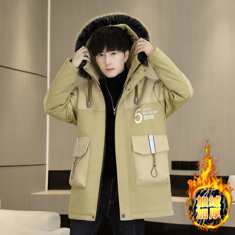2024秋冬男性モデル韓国版冬男性パーカーとベルベットの厚い中長タイプのカジュアルジャケット綿服コート