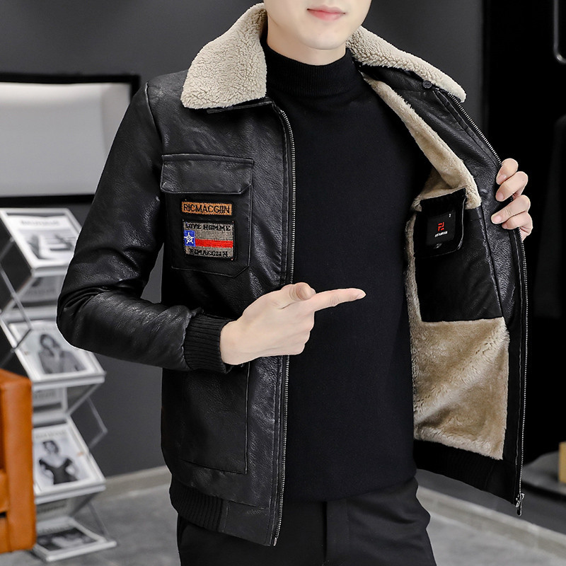 2024秋冬男性モデル韓国版一衣無二立襟皮衣男性ファッション保温毛ジャケット一