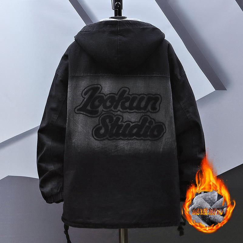 2024秋冬男性モデル韓国版冬にベルベットを厚くした男性フード付きカウボーイのゆるいジャケット青少年コート-