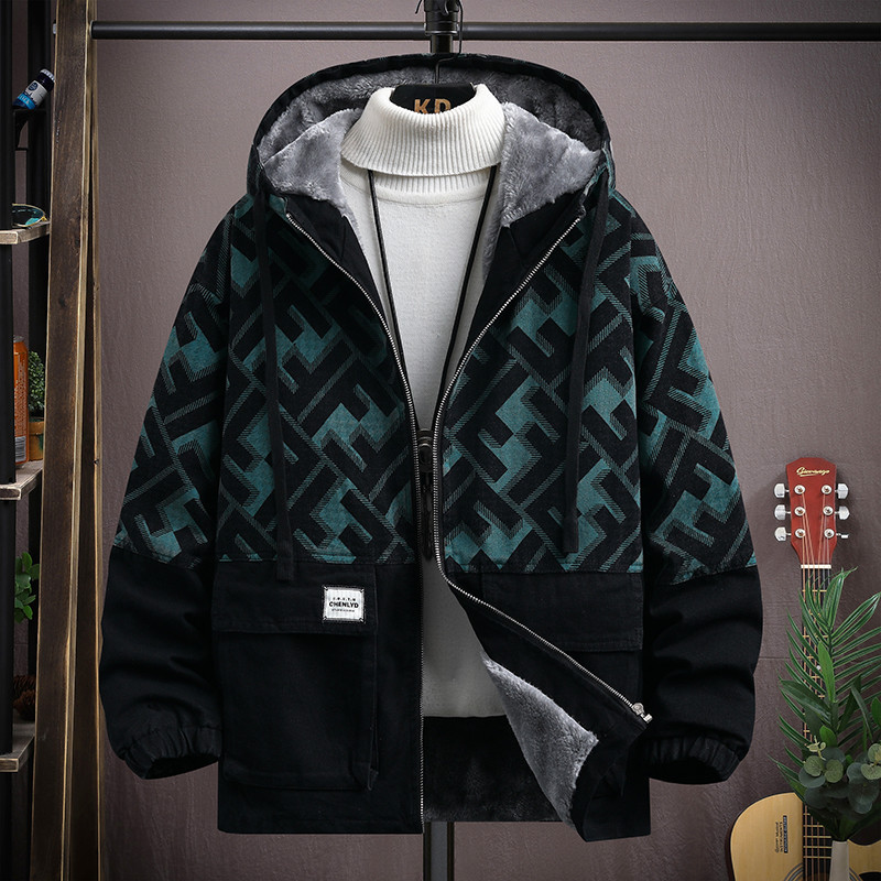 2024秋冬の男性の韓国版秋冬の新型のベルベットと帽子のカウボーイは綿のジャケット-青潮の男性服をつなぎ合わせます。