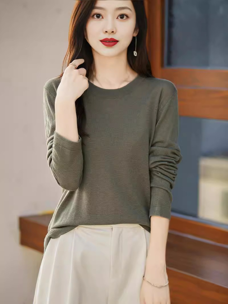 24年秋精紡ウールの薄い丸首の水溶ウールの長袖の女性のゆったりしているプルオーバーのセーターの純色の上着の中で合わせます。