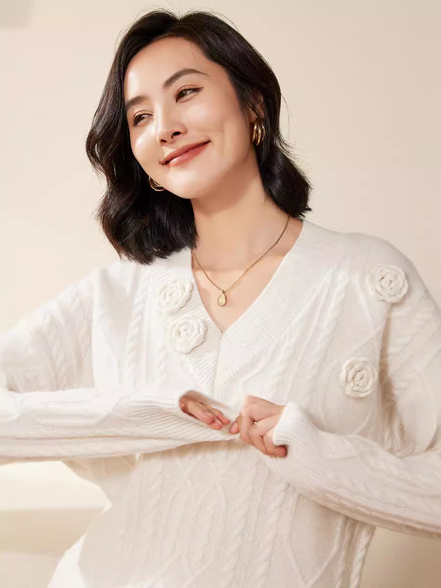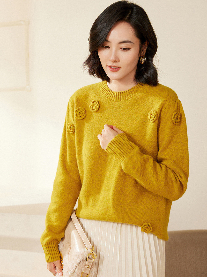 手縫い花100純ウールシャツ女性金ラクダゆるいセーター2024新秋冬丸襟ニットシャツ