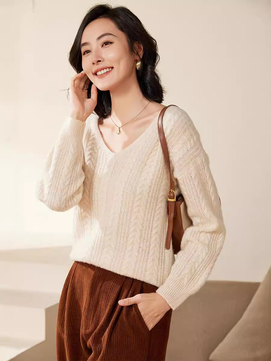 秋冬のウール100% の女性の透かし彫りvネックのニットのセーターはゆったりとしていて、やせています。