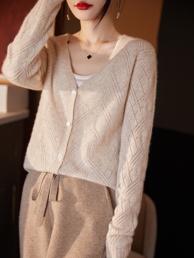 2023新型フランスデザイン感透かし彫りvネック女性純色が痩せている通勤優雅なウールニット長袖