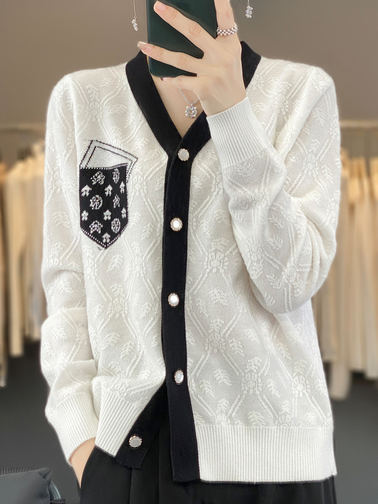 毛混紡vネックニットカーディガン女性コート2023秋冬新作ファッション婦人服衝突色長袖上着