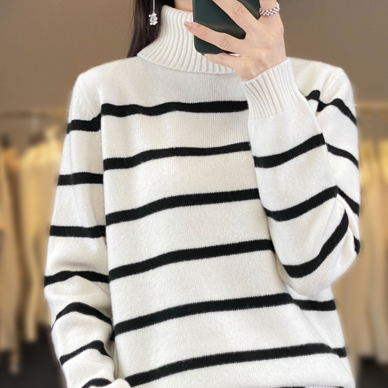 23秋冬新作ウールレディースゆるい半高襟ストライプ肩ボタンショートタイプインナープルオーバーニット