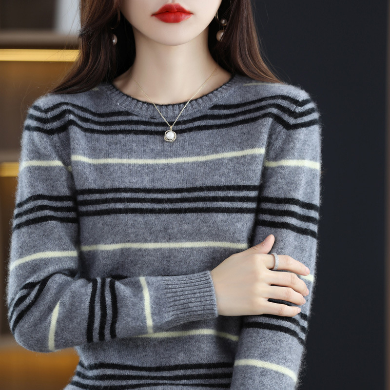 復古風シンプルな古典的なストライプの丸首のセーターはスリムに見えます。