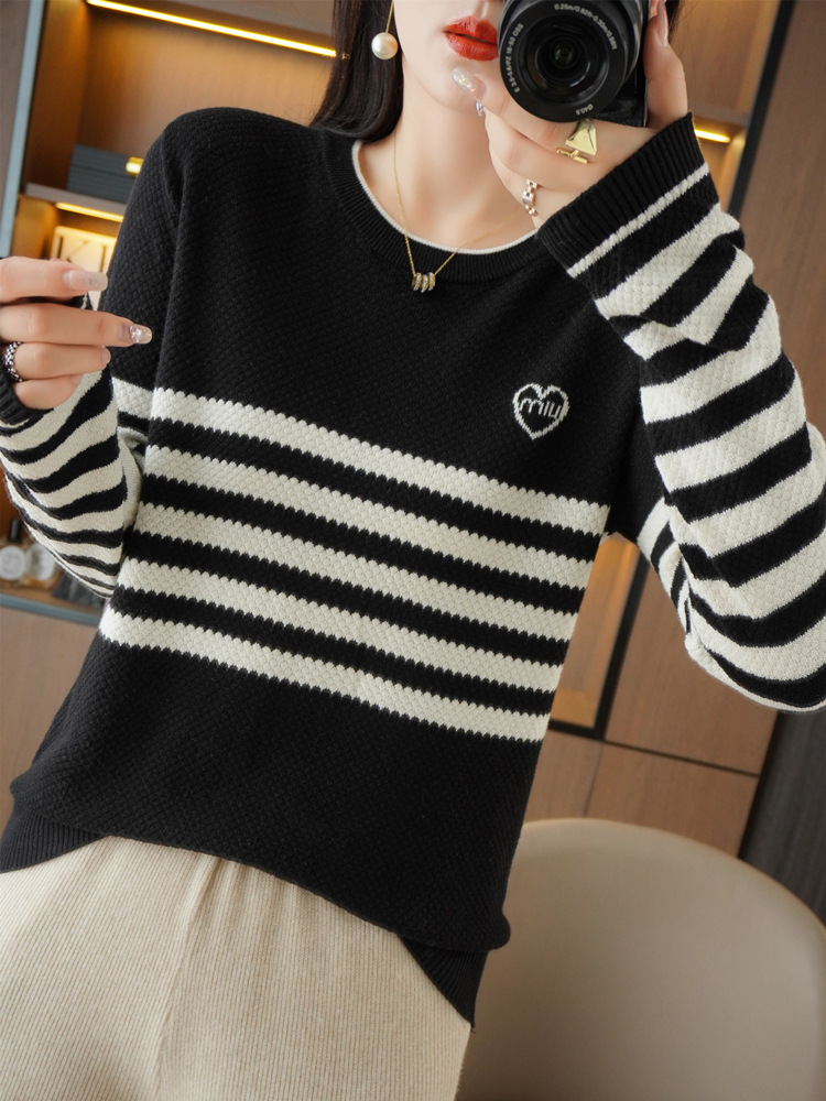 秋冬新作韓国風ファッションストライプ愛プリント丸首セーターゆったりとしたコットンニット女性代発