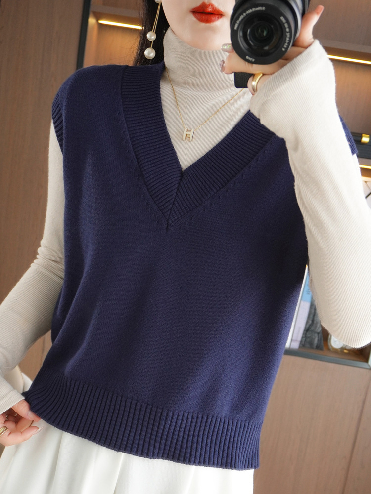 2023春秋の新型のゆったりした百合の怠惰な風の頭のvネックのベストの袖なしのニットの肩のセーターの女性