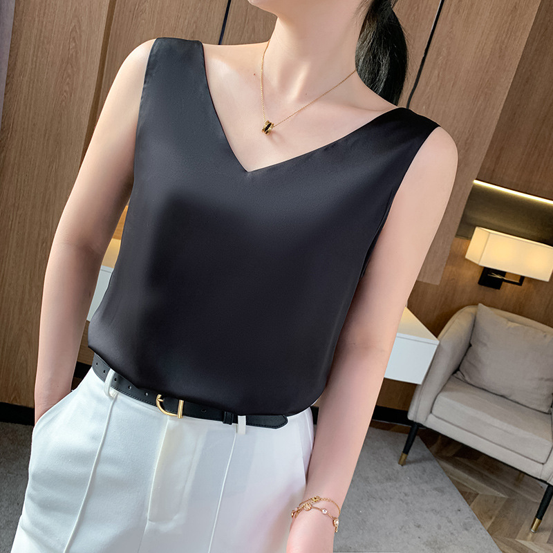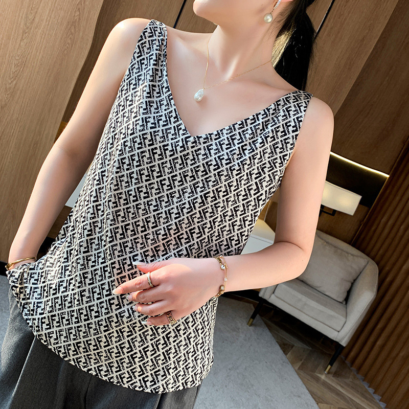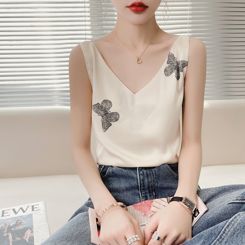 2022夏の新しいvネックプリント文字ストラップベスト女性スーツの中にサテンのシャツの上着を着ている