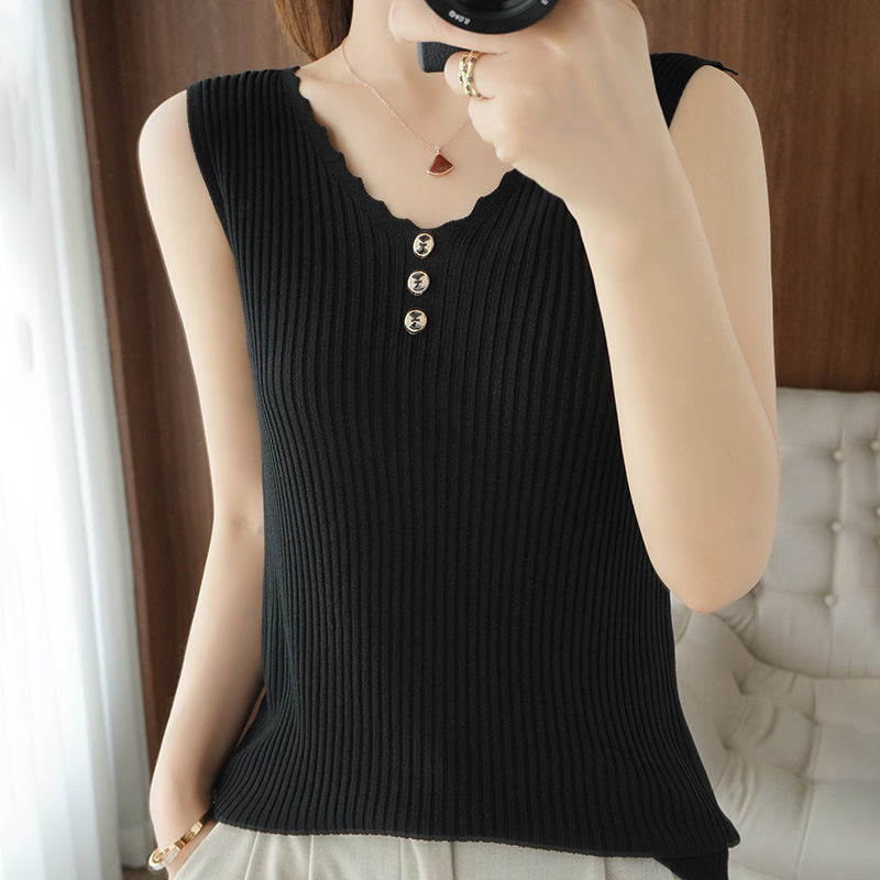 夏の新しいvネックの女性の氷の糸のストラップのベストの袖なしのニットの上着の曲の珠の修身の半袖は底の上着を打ちます。