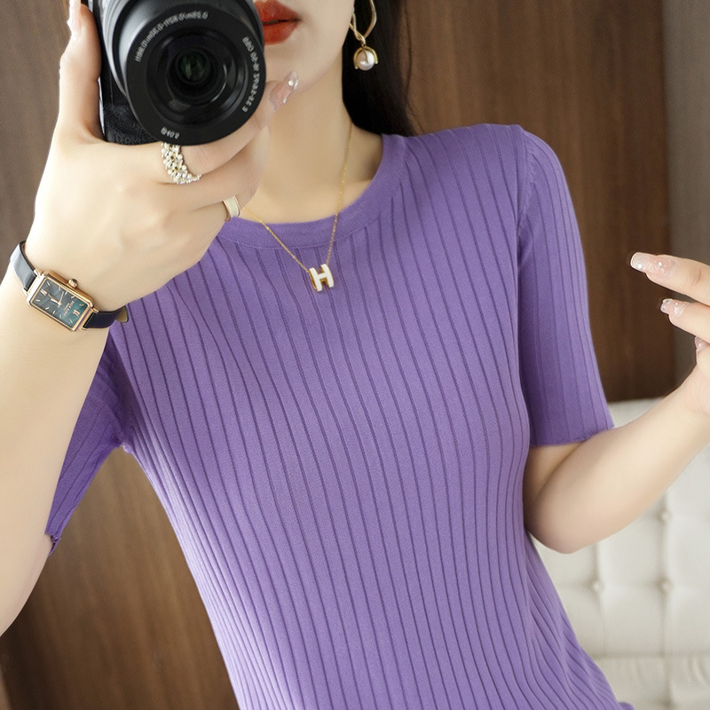 夏の新型氷糸曲珠坑条丸首半袖女性ニットウェアの中に薄いタイプのボトムコートを着ています。