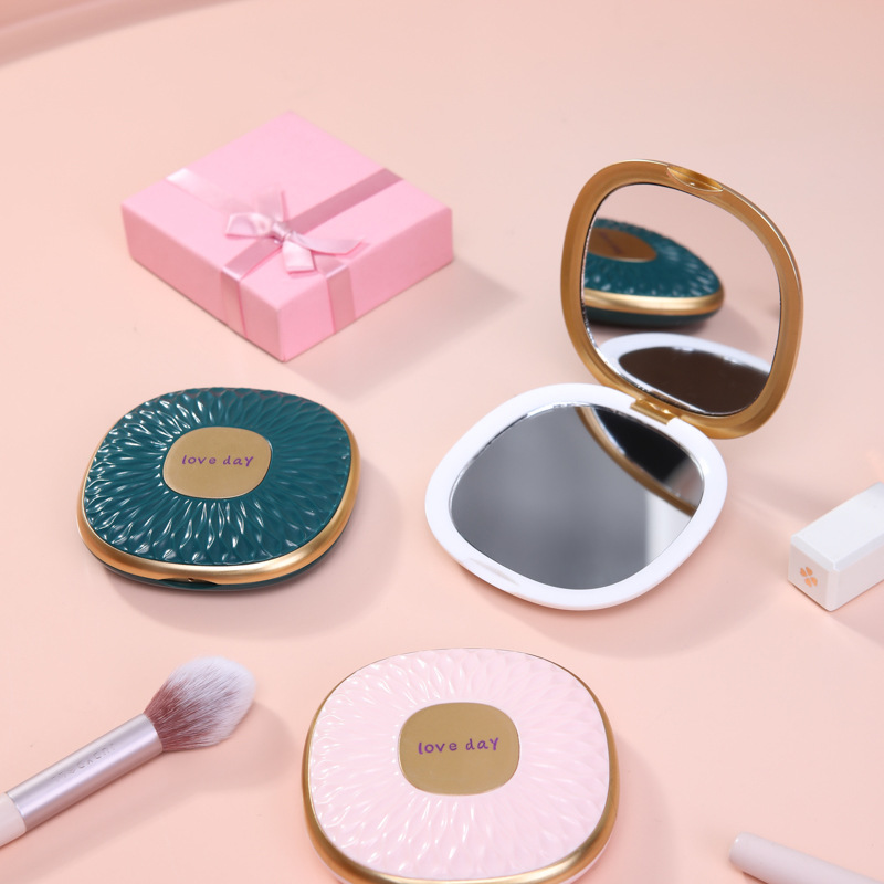 カスタマイズされた携帯便利な小さな鏡学生ミニ両面折り畳み化粧鏡女性は拡大化粧鏡を持っている