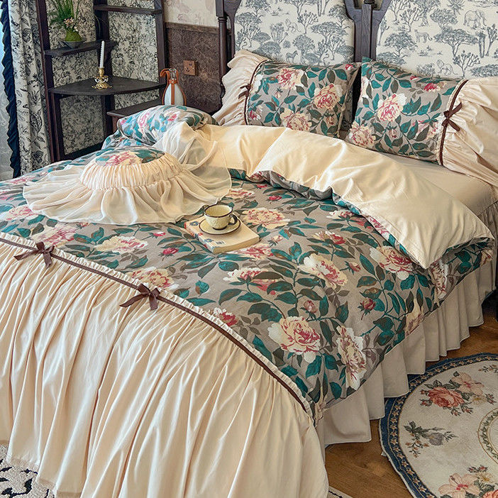 フレンチレトロ高級綿ベッド4点セットプリンセス風純綿キルトカバーベッドスカート女の子寝具3点セット