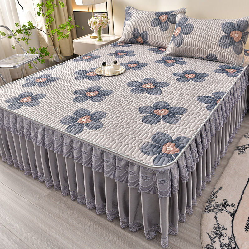 プリンセス風ビーンマットベッドスカート3点セット洗濯機で洗えるアイスシルクマットエアコン付き夏用レースソフトマット