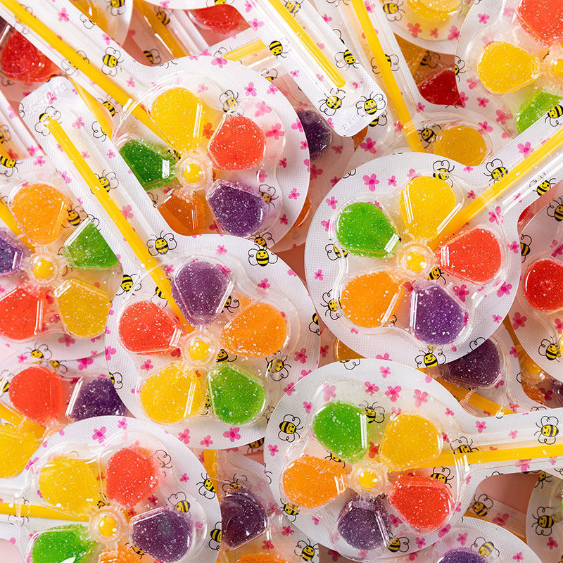 色とりどりの風車の砂糖のグミの卸売りの果物の味のロリポップのネットの赤いレジャーの間食の漫画の虹のキャンディーの大きい風車