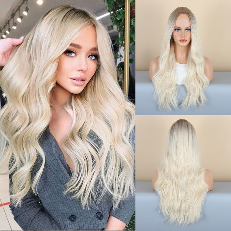 欧米のかつら化学繊維の新型アマゾンの女性の染色の長いカールの大きい波の中でかつらの頭のカバーを分けて卸売りします。