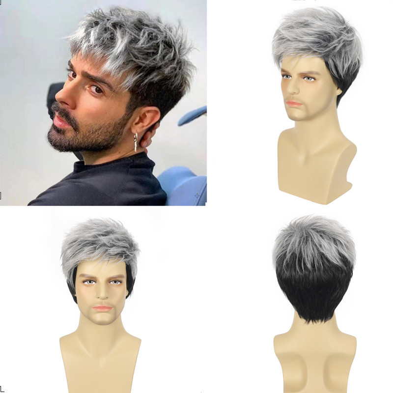 新型クロスボーダー電気商男性灰色の白いふわふわした短いカール欧米男性のかつらセットの現物卸売り