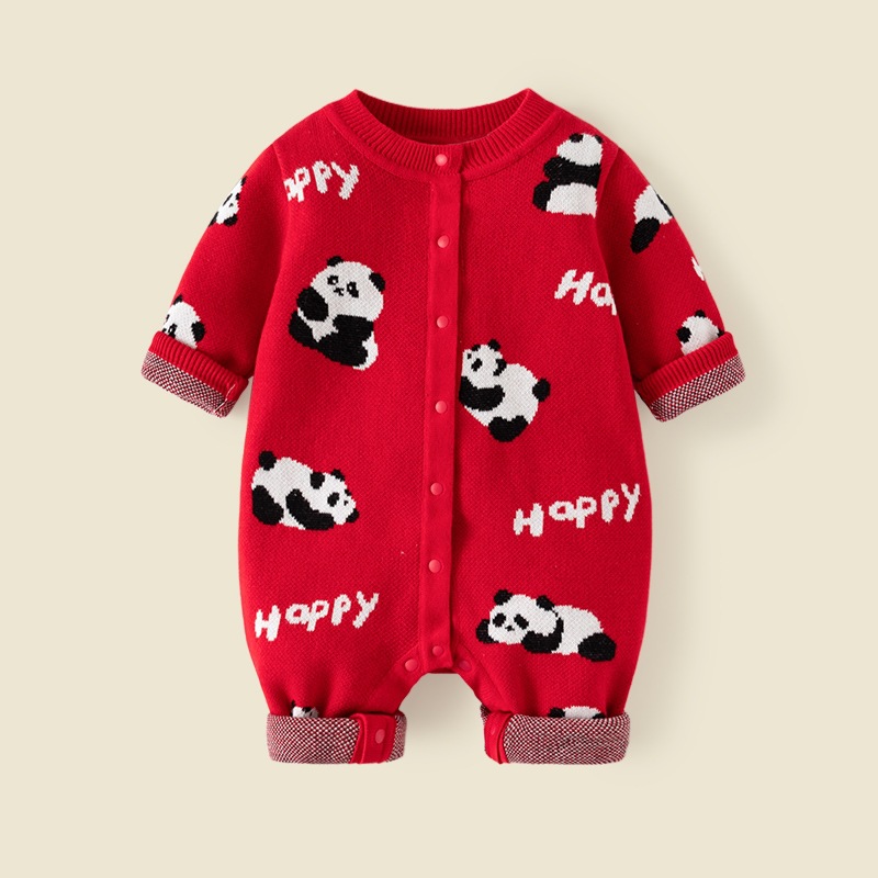精練綿のパンダのニットの連体の服の新生児の赤ちゃんは新年の赤いセーターの服を登ります。