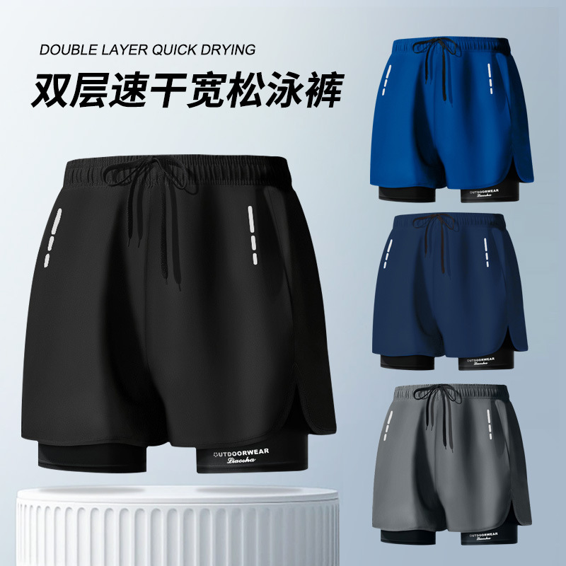 男性水泳パンツ学生スポーツパンツ二重ランニングスポーツパンツ頭フィットネス気まずいビーチパンツ水泳パンツ