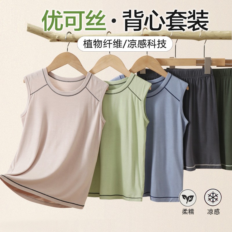 子供ベストショーツセット夏薄いアイスシルクモーダル男の子と女の子ホーム服クールノースリーブパジャマパンツ