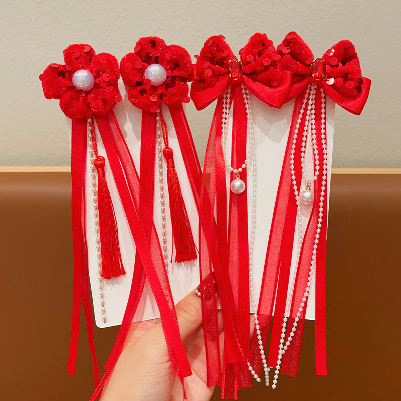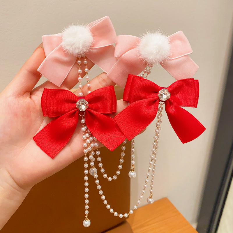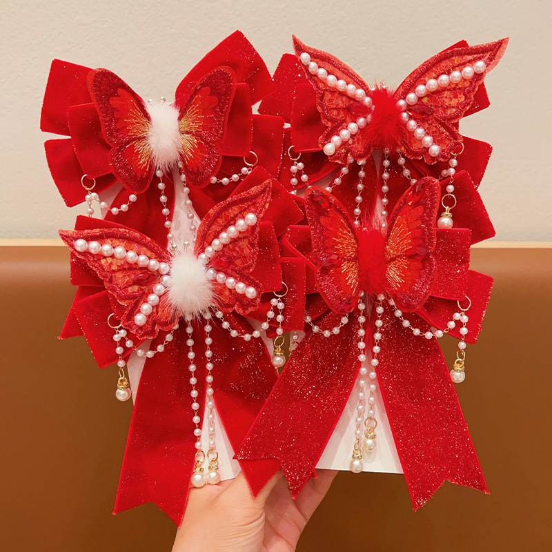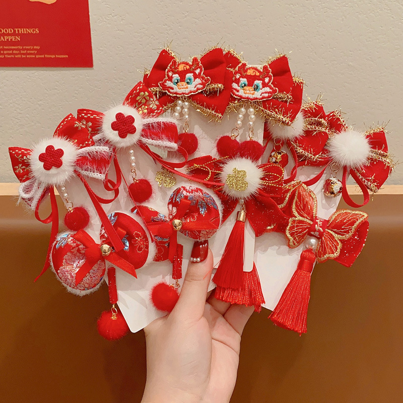 子供の蝶結びのヘアピンの女の子の赤いぬいぐるみのお祝いの前髪のサイドクリップの女の子は新年の髪飾りを傷つけません。