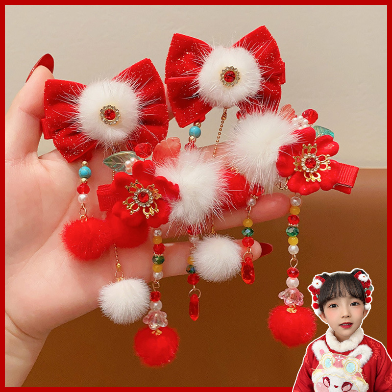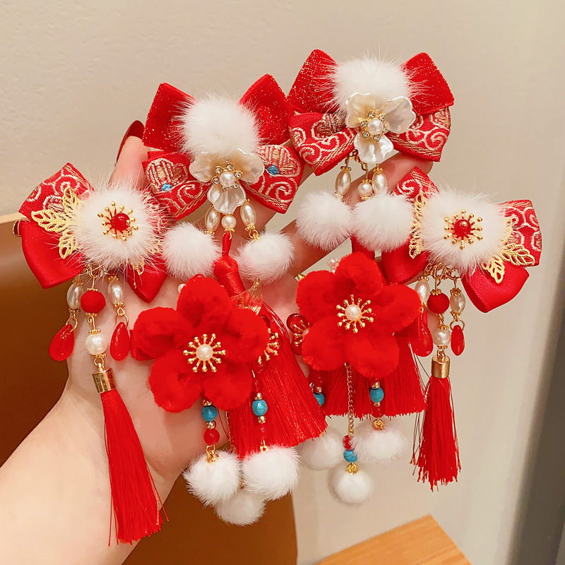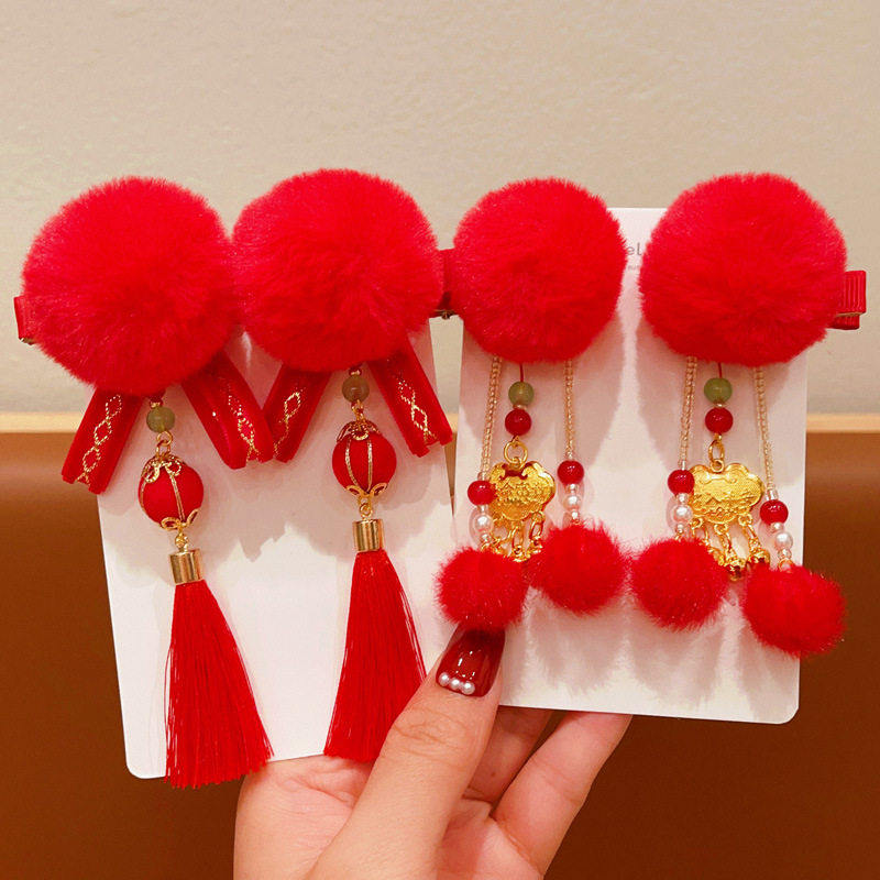 新年の子供の古風な髪飾りの女の子のお祝いの赤い毛玉のフリンジヘアクリップの女の子の新年の中国風の髪飾り