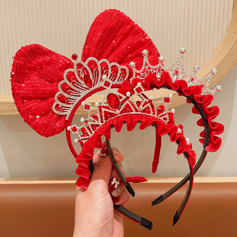 女の子の赤い蝶結びの頭飾りの女の子のヘアピンの王女の王冠の蝶結びの赤いお祝いのスパンコールのヘアピン